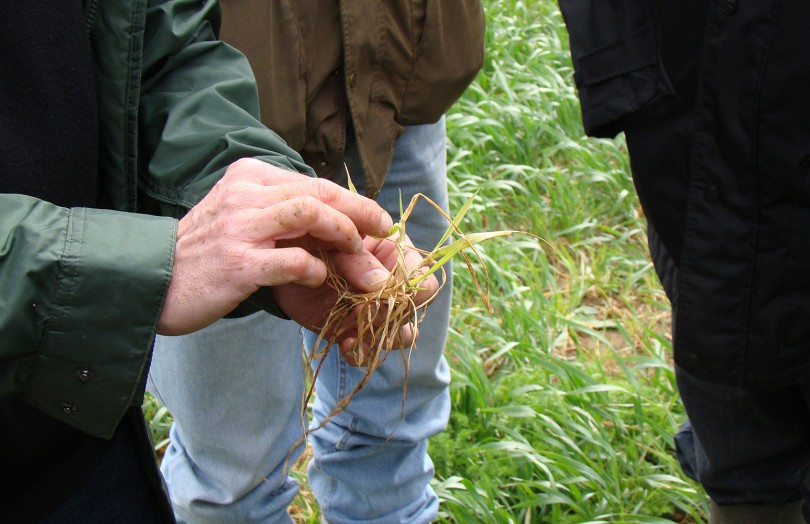 Les symptômes les plus fréquemment observés sont typiques d’Heterodera avenae (photo) : système racinaire très affecté avec présence de chevelu racinaire et de kystes ou d’amas de racines. Un retour fréquent de blé dans la rotation ainsi qu’un été précédent chaud favorisent les nématodes. Le froid relatif de janvier a certainement permis aux kystes d’éclore et de contaminer les parcelles. Les seuls moyens de lutte sont agronomiques (plantes de coupure, changement d’espèces, interculture…). Sur les zones atteintes, les plantes ont des stades en retard et présentent un tallage réduit (maître-brin seul généralement). Dans les secteurs les plus touchés (Castelnaudary, Bram, Villasavary), les symptômes étant restés longtemps et la reprise de végétation, lente, il est très probable que le potentiel de rendement soit déjà affecté.