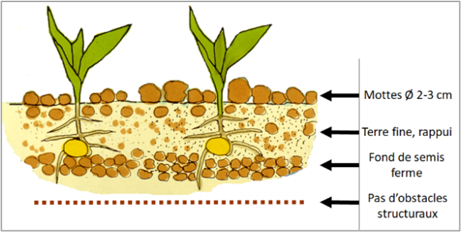 Avec ou sans labour, la préparation du sol doit permettre d’obtenir un lit de semence avec assez de terre fine pour un bon contact sol-graine, quelques mottes en surfaces et un bon rappuyage pour assurer une continuité sur tous les horizons.