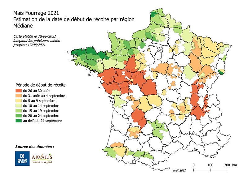 Pour chaque « région », les experts d’ARVALIS ont défini le groupe de précocité dominant et la date médiane des semis en 2021. Avec les données météo de l’année en cours et les données statistiques sur les semaines à venir, il est possible de prévoir une période à laquelle le stade optimal de récolte, 32-33 % de matière sèche plante entière, sera atteint. Cette prévision est régulièrement mise à jour pour prendre en compte le climat de l’année. Afin d’étaler la période de chantier, et pour éviter les récoltes tardives à taux de matière sèche trop élevé, la carte propose une période de début de récolte par région.