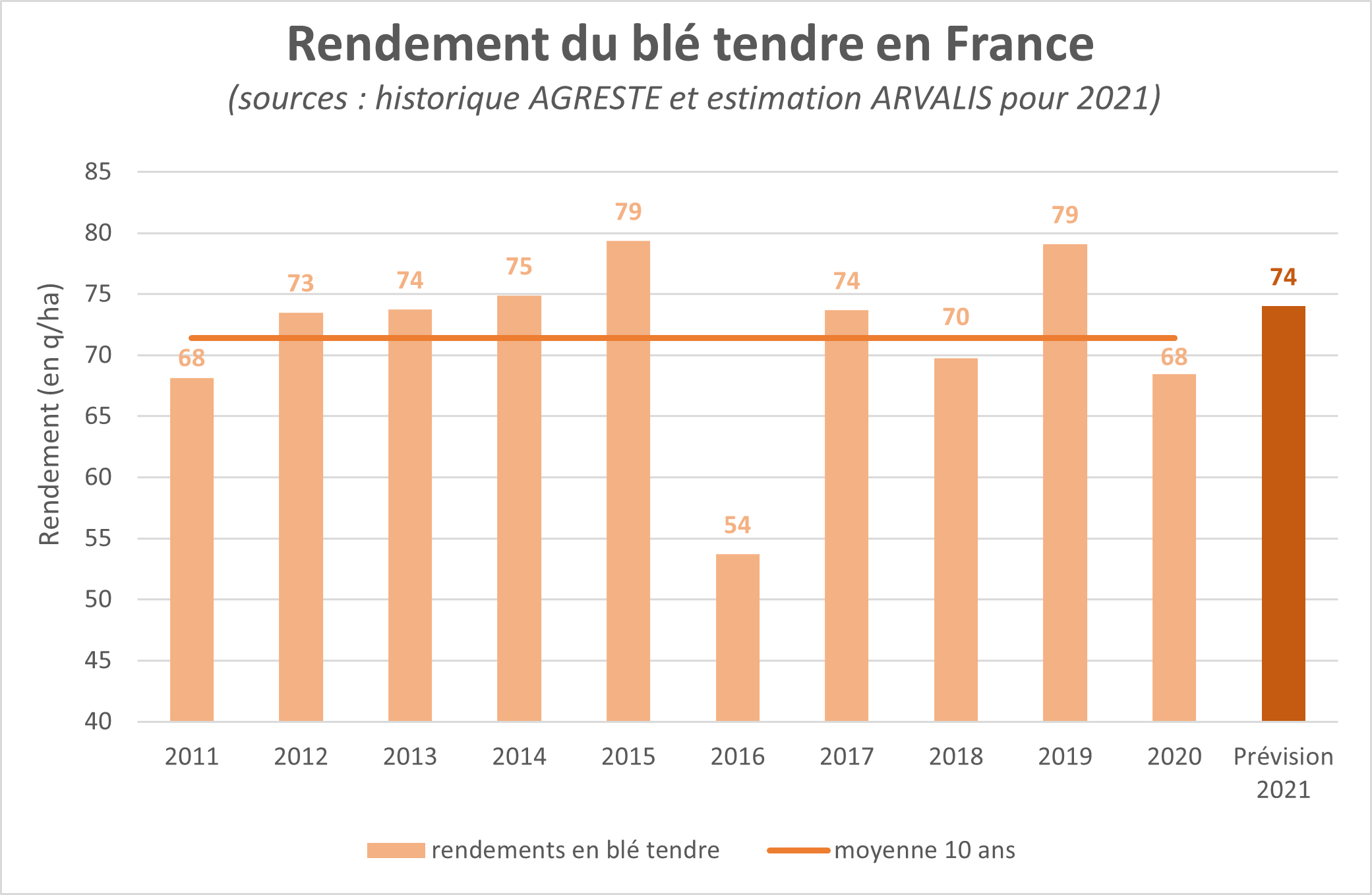 En termes de qualité des grains, ARVALIS - Institut du végétal estime que la teneur moyenne en protéines dans le blé tendre français atteindrait 11.6 % en 2021, une valeur équivalente à celle de 2020 et à la moyenne décennale. Ce critère est déterminant pour satisfaire les exigences des marchés.