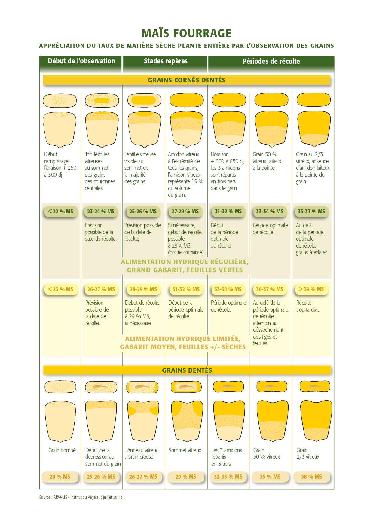 L’observation du remplissage des grains, 3 à 4 semaines après la sortie des soies (stade repère de la floraison), permet encore d’affiner la date optimale de récolte. C’est la date ultime pour ajuster les plannings de récolte pour les CUMA et les entrepreneurs. En effet, à cette date, il est facile de repérer la lentille vitreuse qui apparait à l’extrémité des grains. La lentille vitreuse, jaune dorée et difficilement rayable à l’ongle, correspond au dépôt d’amidon vitreux. Quand la lentille vitreuse est visible au sommet de la majorité des grains, on se situe autour de 25-26 % de matière sèche plante entière pour des maïs à bon gabarit, encore bien verts. Sur les variétés à grains dentés, cela correspond à l’apparition d’une dépression au sommet de la majorité des grains. Pour atteindre le stade optimal de récolte, en besoin en températures, cela représente environ 150 degrés jours (base 6-30 °C) soit 10 à 20 jours selon les régions, la période de récolte et le scénario climatique.
