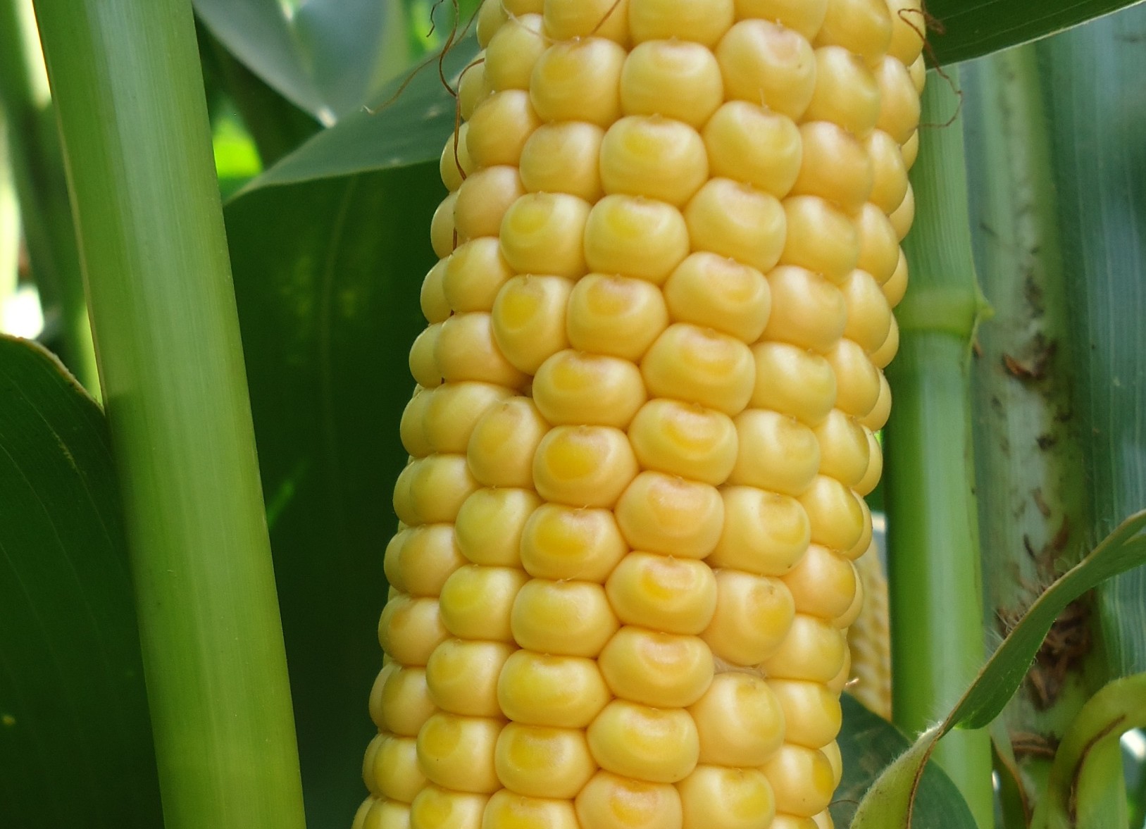 Trois semaines à un mois après floraison, la visite des parcelles de maïs fourrage est indispensable pour observer le remplissage des grains et affiner une dernière fois la date optimale de récolte. A cette date, on repère facilement la lentille vitreuse à l’extrémité des grains. La lentille vitreuse, jaune dorée et difficilement rayable à l’ongle, correspond au dépôt d’amidon vitreux. Quand on voit la lentille vitreuse au sommet de la majorité des grains, on se situe autour de 25-26 % de MS plante entière pour des maïs à bon gabarit, encore bien verts. Sur les variétés à grains dentés, cela correspond à l’apparition d’une dépression au sommet de la majorité des grains. Cas de figure fréquent cette année, pour des maïs à gabarit moyen, avec des feuilles en partie desséchées, à ce stade, on sera déjà autour de 28-29% MS.