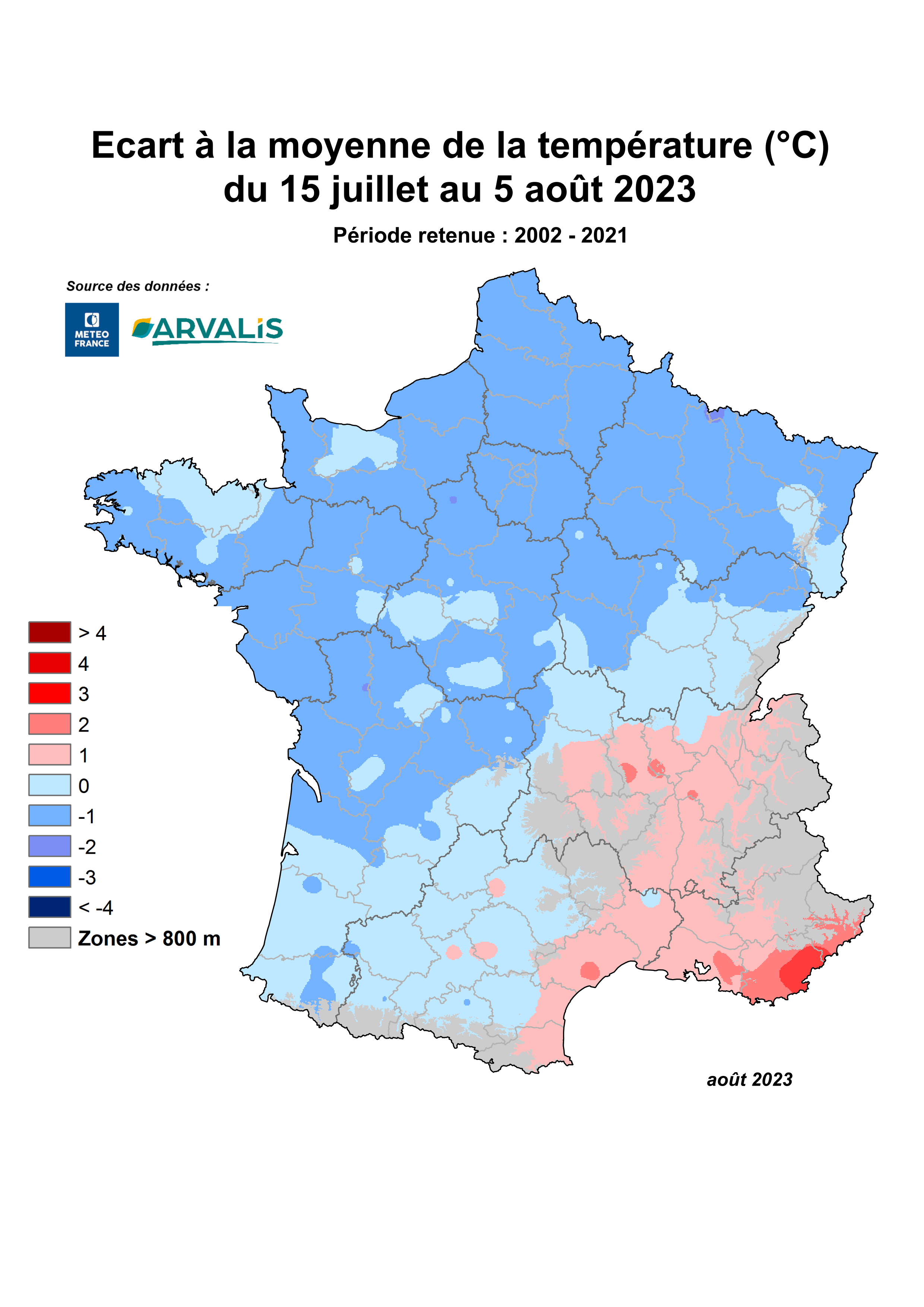 Cartes : écart à la moyenne de la température (°C) du 15 juillet au 5 août 2023 ; cumul de précipitations (mm) du 15 juillet au 5 août 2023 - Source Météo-France – traitement des données par ARVALIS