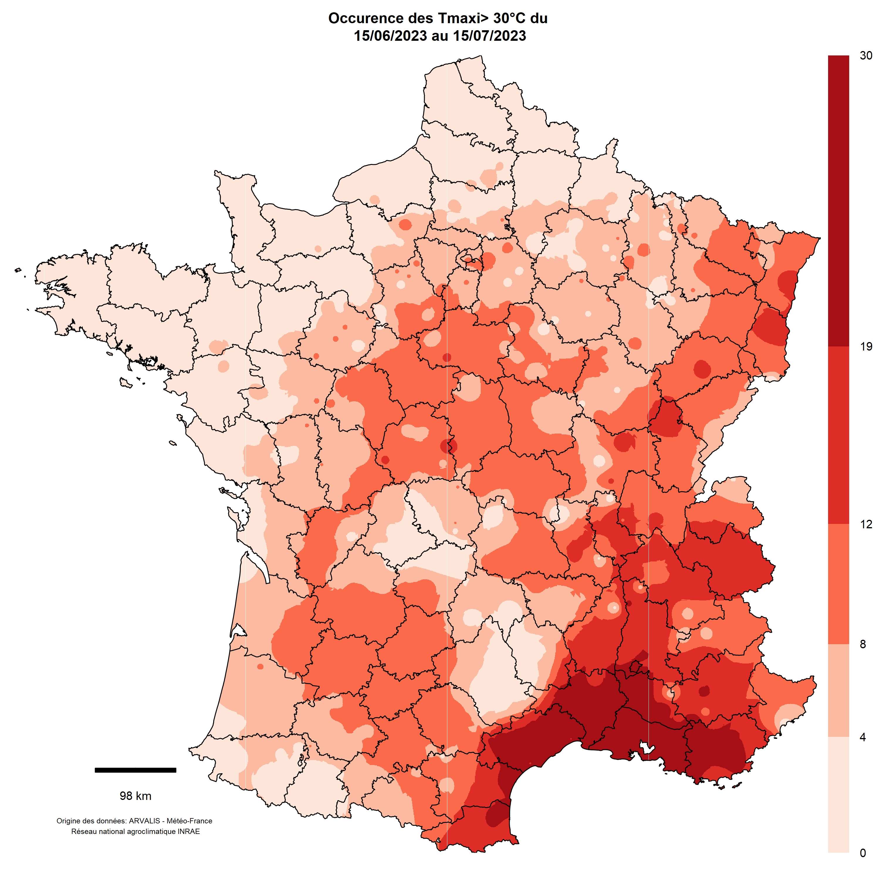 Cartes : nombre de jours avec des température maximales > 30°C et cumul de pluie (mm) entre le 15/06 et le 16/07/2023, Source Météo-France – ARVALIS