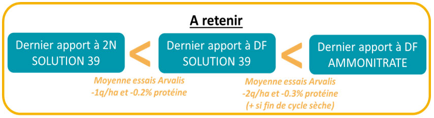 → les apports de 40, voire 80 kg N/ha, conseillées par un outil d’aide à la décision en fin de cycle sont généralement très bien valorisés (+4 à 6 q/ha et +0,6 % de protéines), tout en permettant de s’adapter au contexte climatique et parcellaire pour ne pas gâcher d’azote.