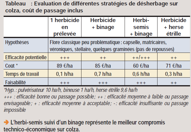 Ainsi, sur colza, les stratégies mêlant du mécanique et du chimique peuvent rivaliser en coût et même en temps, à la stratégie classique d’application de prélevée.