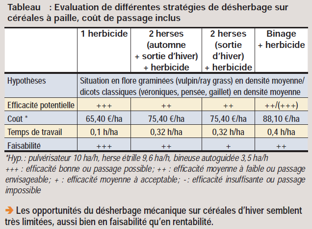 L’introduction du désherbage mécanique dans les céréales à paille coûte a minima 10 €/ha de plus qu’une stratégie « tout chimique », en conditions favorables (hors résistance par exemple), pour un temps passé au moins 3 fois plus élevé. Ajoutés au peu de temps disponible, ces résultats renforcent la difficulté de s’appuyer sur ces techniques pour le désherbage des céréales d’hiver. Le désherbage mécanique sur céréales à paille est donc une stratégie d’appoint à réserver à des situations particulières (zones spécifiques, parcelles proches de l’exploitation, etc…).