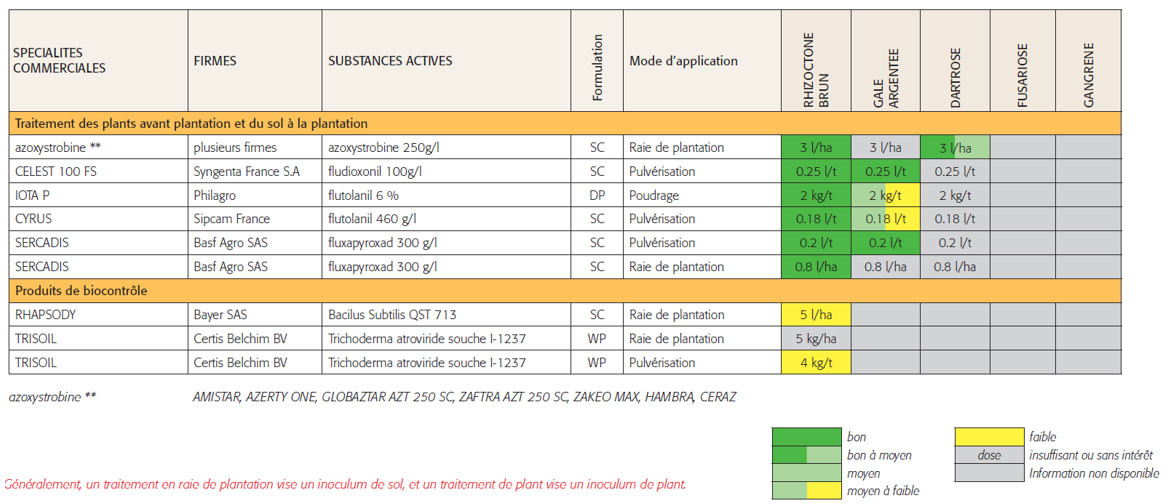 Contre le rhizoctone brun, la lutte doit se faire via un traitement de plant si l’inoculum provient du plant. S’il provient de la parcelle, un traitement de sol sera plus adapté.