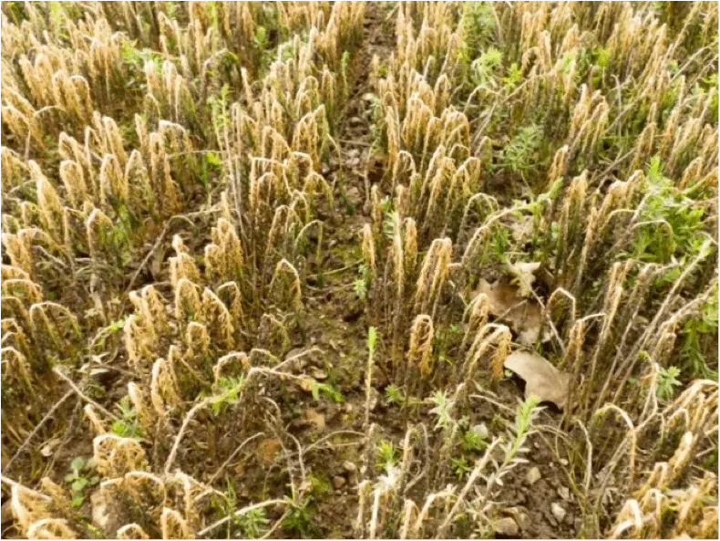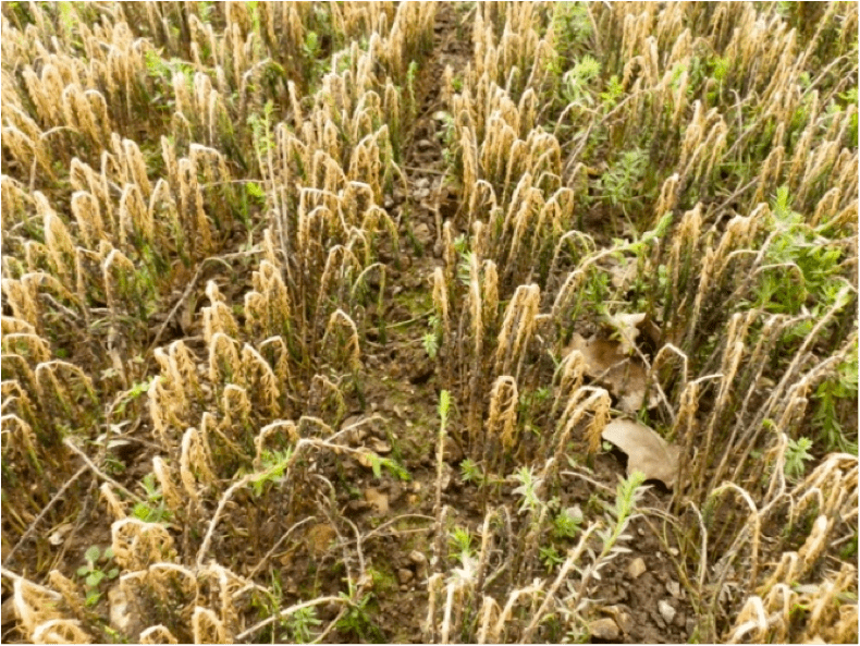 La résistance des racines à l’arrachement est un bon indicateur et signifie souvent que les plantes sont encore vivantes. Les plantes mortes présentent des racines nécrosées, ou non, auxquelles peut s’ajouter un resserrement et/ou un desséchement du collet (photo ci-dessous).
