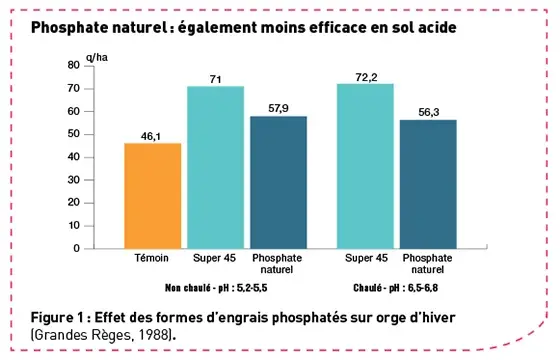 La nature de l’engrais est particulièrement importante pour le phosphore. Le superphosphate et le phosphate diammonique (18,46) sont recommandés pour tous les types de sols. Les scories phosphatées sont à réserver aux sols acides. Le phosphate naturel est déconseillé car son efficacité est toujours inférieure à celle des autres formes. En revanche, aucune contrainte agronomique liée au potassium ne détermine le choix entre le chlorure ou le sulfate de potasse. Le prix des engrais ou les besoins de la culture en chlorure ou sulfate pourront orienter ce choix.