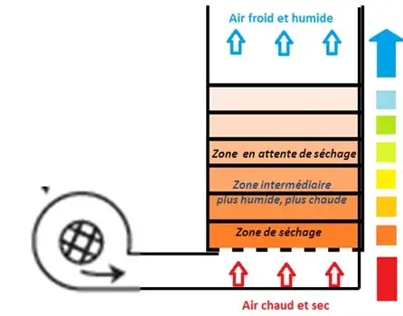 L’air de ventilation se charge en humidité de bas en haut jusqu’à ce qu’il arrive à saturation. Il passe alors dans les couches supérieures sans effet séchant.