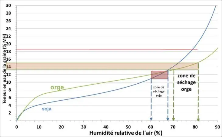 Par exemple, pour l’orge, l’air de ventilation doit présenter une hygrométrie comprise entre 80 et 70 % pour ramener les grains à une teneur en eau voisine de 14 % ± 0.5. Les consignes, comparables pour le blé, sont différentes pour le soja.