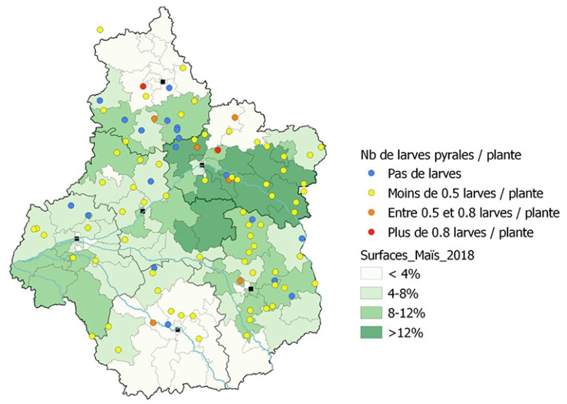 Carte 1 : Infestations larvaires en pyrales sur la région Centre en 2024