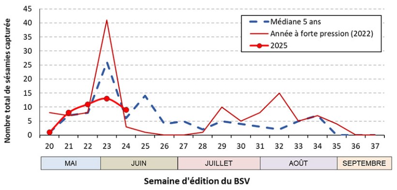 La sésamie, bien installée sur les secteurs Touraine et Champagne Berrichonne, est également piégée dans les parcelles de maïs du Val-de-Loire, voire Sud Beauce (absence pour le moment en Auvergne et Ile-de-France). Les vols de première génération ont démarré tôt dans la saison (figure 1). On estime que 50 % des vols ont eu lieu autour du 5-10 juin.