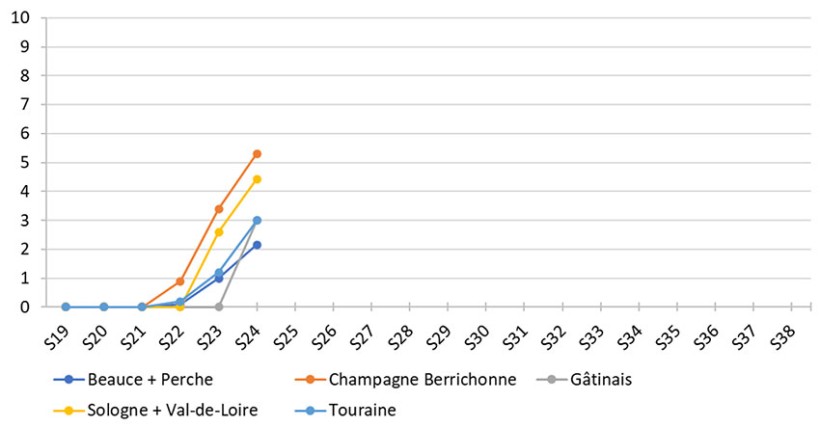 Concernant les pyrales, les captures sur pièges à phéromones se sont intensifiées fin mai dans les secteurs les plus chauds (Champagne Berrichonne). Les conditions actuelles leur sont favorables, ce qui explique des captures en hausse sur les secteurs « plus froids » : Beauce, Ile-de-France et Allier à partir du 5-10 juin (figure 2). A noter que le secteur Limagne ne démontre pas de pyrales pour le moment.