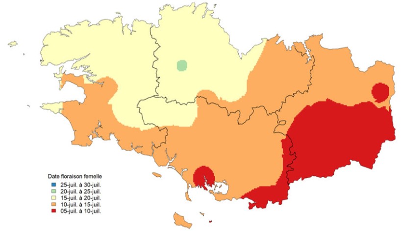 En termes de précocités variétales, elles s’étalent du groupe très précoce S0 (indice 150-240) dans les secteurs plus froids du centre Bretagne à demi-précoce S2 (280-310) dans l’est de l’Ille-et-Vilaine, en passant par une majorité de précoce S1 (240-280).