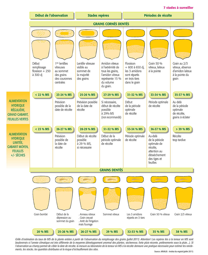 En 2001, à partir de nombreuses mesures faites au champ, ARVALIS - Institut du végétal a publié une première grille d’estimation du taux de matière sèche (MS) du maïs fourrage plante entière à partir du visuel du grain. Largement diffusée en son temps, cette grille fait encore référence. Mais elle avait besoin d’une actualisation, pour tenir compte de dix ans de progrès génétique mais aussi afin d’intégrer l’influence des conditions de végétation sur l’état de l’appareil végétatif.