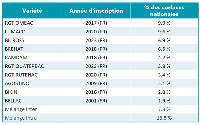 Les 10 premières variétés semées en pure représentent un peu plus de 50 % des surfaces. RGT Omeac occupe toujours la tête du classement avec 9,9 % des surfaces (-0,8 point par rapport à 2024), suivie de Lumaco et Bicross. Les variétés RGT Quaterbac, Agostino et Bellac font leur entrée dans le classement, au détriment de Vuka, Trimaran et RGT Gwendalac.