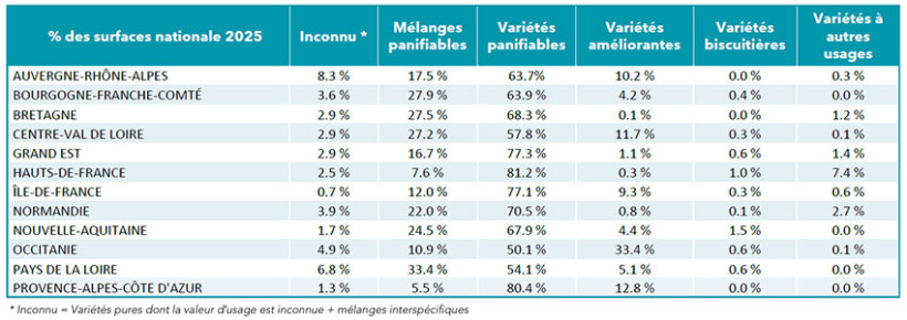 Tableau 2 : Répartition par région des types de blé tendre (en % des surfaces nationales) – récolte 2025