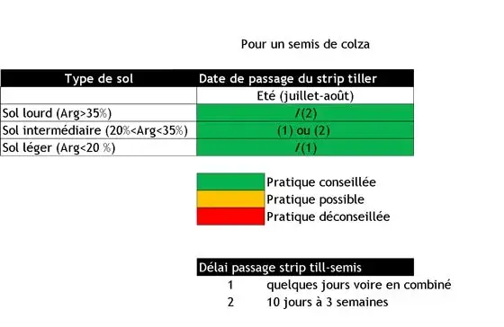 Un travail « classique », avec un passage unique de strip-till précédant le semoir de quelques jours, peut s’envisager seulement dans les sols légers voire intermédiaires. Dans le cas des sols argileux, le travail profond doit être obligatoirement réalisé sitôt la parcelle récoltée et un passage de disque mulcheur (reprise superficielle) sur le rang peut être éventuellement envisagé avant le semis pour affiner suffisamment la bande.