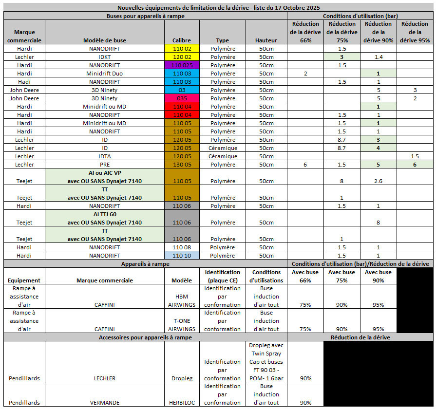 Outre les matériels homologués en viticulture et en arboriculture, la dernière liste, publiée le 17 octobre 2025, s’enrichit de 18 buses. Il s’agit de buses à injection d’air classique ou basse pression principalement avec des angles de 110 ou 120°. On retrouve également deux nouveaux appareils à rampe du constructeur Caffini : le T-One Airwings et le HBM Airwings . Ces deux appareils, combinés avec des buses à injection d’air, peuvent être homologués à 75 % de réduction de dérive (avec des buses homologuées à 66 %), ou à 90 % (avec des buses à 75 %) et à 95 % (avec des buses à 90 %).